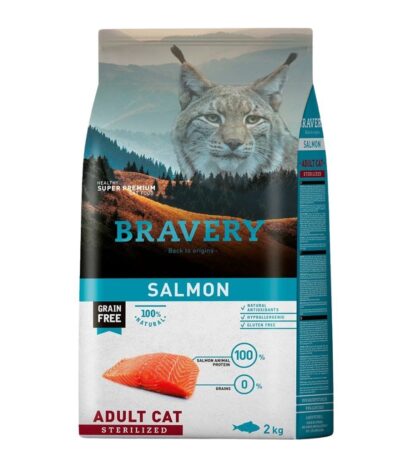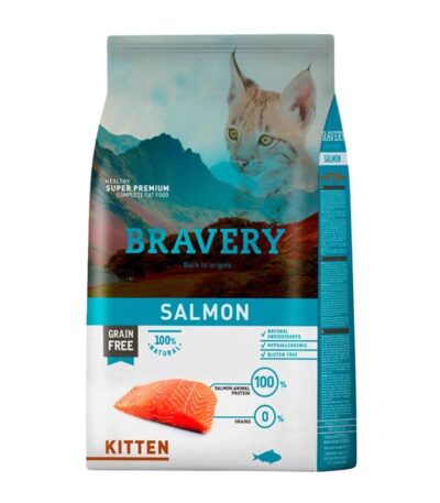 Bravery de salmón para gato cachorro contiene carne de elevado contenido en proteínas de alto valor biológico, de alta digestibilidad y palatabilidad. El salmón es beneficioso para reforzar el soporte inmune y prevenir enfermedades cardiovasculares. Es una fuente natural de ácidos grasos Omega 3, los cuales son esenciales para mantener una salud óptima. Su alto contenido en vitamina D fortalece los huesos. El aceite de pescado ayuda a mantener una piel saludable y un pelo brillante.
