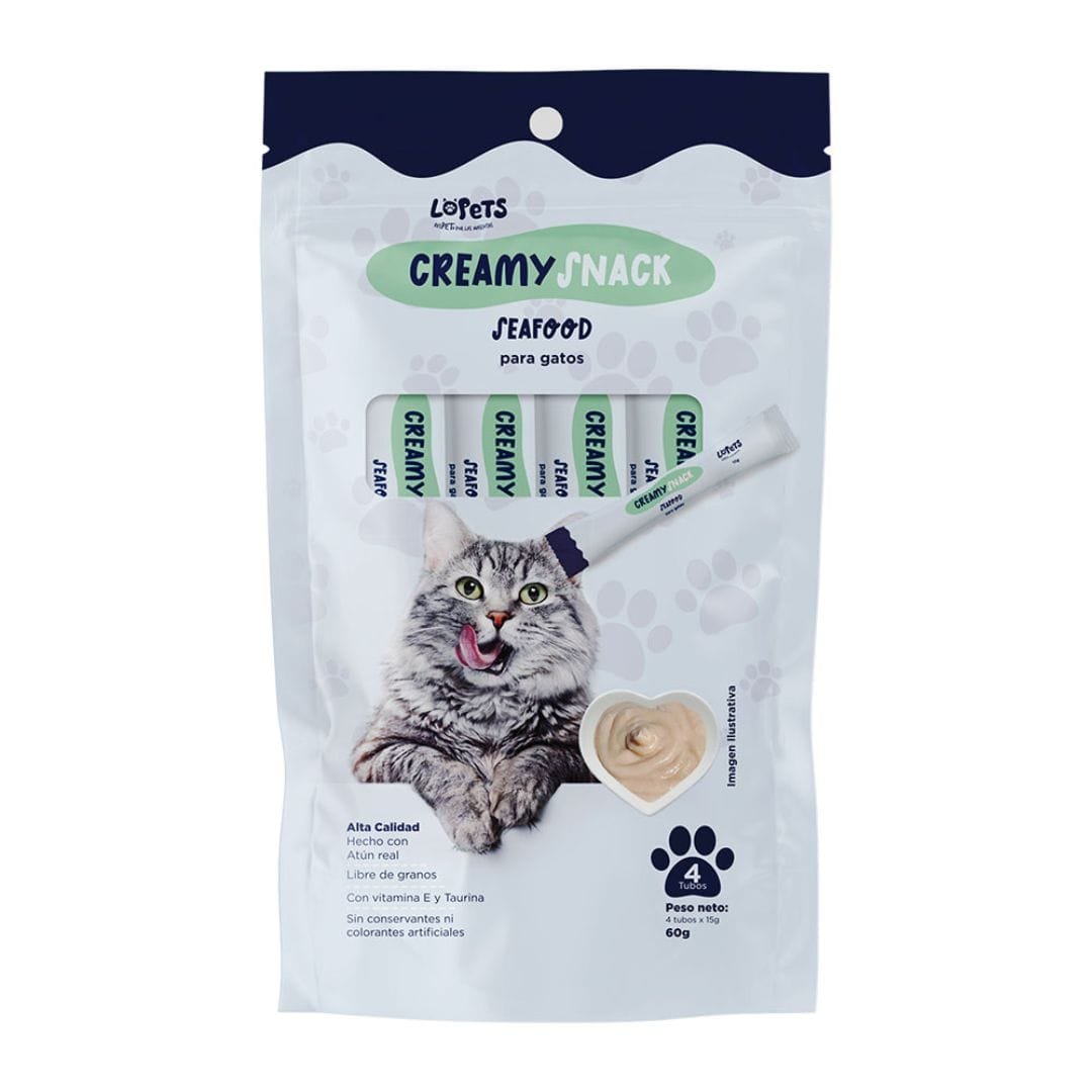 Snack cremoso para gatos, sabor pescado y mariscos, delicioso e irresistible. Su textura suave y cremosa, facilita su consumo, siendo ideal para gatos. Libre de granos, con vitamina E y Taurina. Sin conservantes ni componentes artificiales. Ingredientes: Carne blanca de atún, verdel (Caballa), camarón hidrolizado, gelatina en polvo, extracto soluble de pescado, extracto de calamar, fructooligosacáridos, taurina y vitamina E. Indicaciones de uso: Suplemento alimenticio para gatos adultos de todas las razas desde los 12 meses de edad. El sobre contiene 4 porciones de 15 g cada una y en un práctico empaque cilíndrico (Tubo).